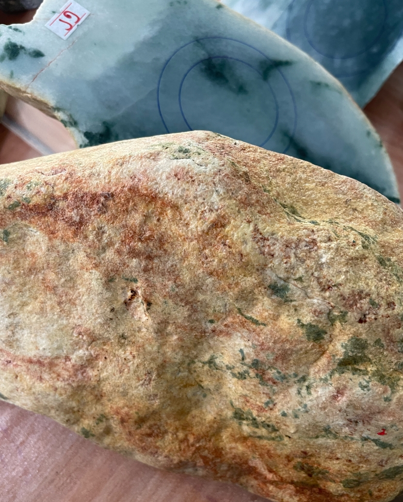 所以,蟒带对于研究翡翠原石内部的种水品质,色的分布,还是非常有价值的,尤其是色蟒,也就是翡翠原石的皮壳上,有绿色的带子,这样的石头,往往都是抢手货,一定会被重点关注,行家们都会仔细研究的。