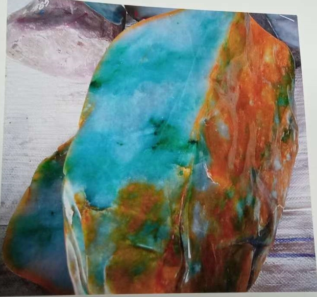 图 4 三彩玉料。蜂蜜雾,数量多,但绿色比较少。算是比较好的三彩玉。